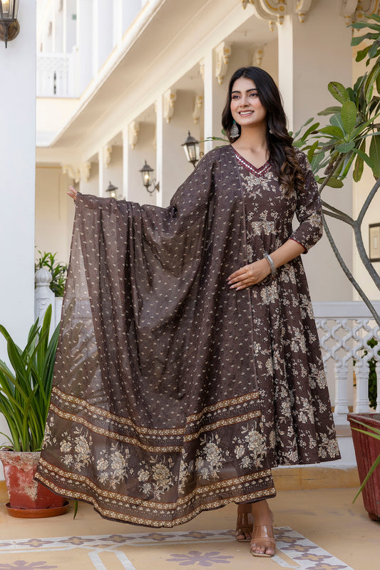 Women's Floral Printed, Premium Cotton Anarkali Suit Set